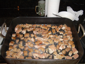 | • 2 pound fresh pork skin with a 1/4 inch layer of hard fat attached | This can be tricky to find. Most butchers don't even have access to pig skin, while others may require that you buy 50 pounds as this is the basic distribution unit. We tend to go with Savenor's in Boston. If you just cannot get any pig skin, see if you can get any pork fat back with skin on it, cut off all but 1/4 inch of fat and then blanche it for five minutes. We've done this in a pinch, and it works. |