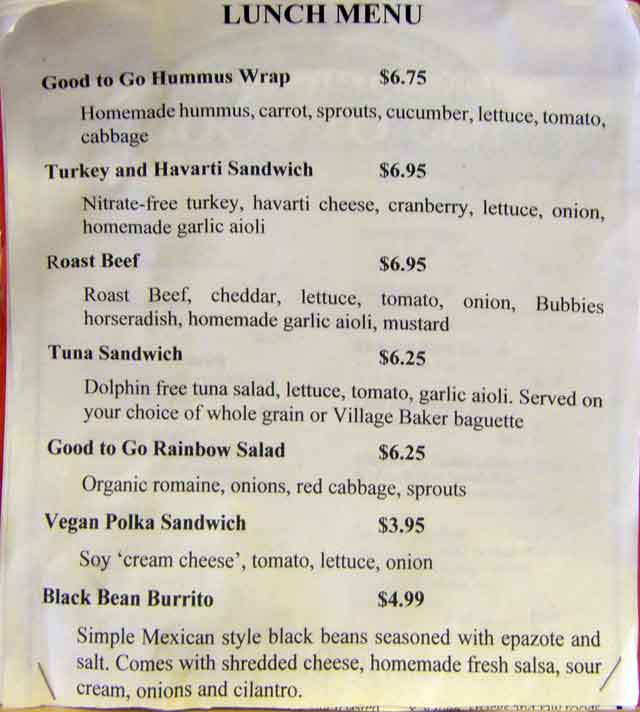 Good To Go also has excellent sandwiches. If you are going on a hike, they are conveniently located on Lauridsen Boulevard, which leads to route 101 heading west, a block or two west of Race Street, which leads to Hurricane Ridge Road. We especially liked their hummus wrap which has great, sweet, local carrots in it along with smokey hummus, lettuce, tomato and sprouts. The bean burrito would feed a family of four. We also liked their turkey and havarti and their simple tuna sandwich, both on whole wheat bread. We've scanned in their lunch menu, so you can call them up with your order before your next North Olympic adventure.