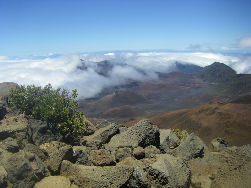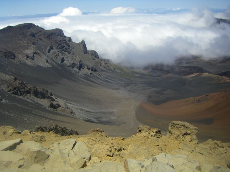Haleakala looms ten thousand feet over the island of Maui. Its summit is another world, quite unlike the world at sea level below. Even the air is different, thinner, cooler and drier. There are strange plants and birds up there, and the crater itself, full of shifting sands, is so immense it is hard to make sense of the view.