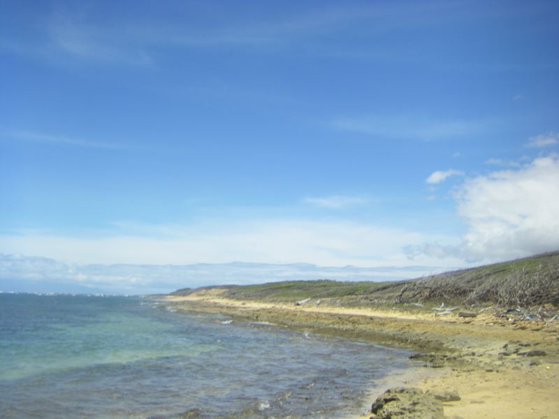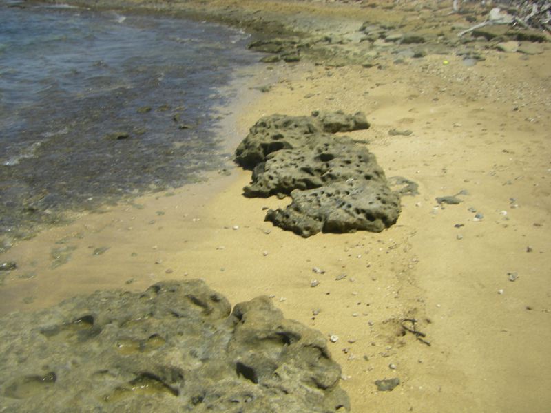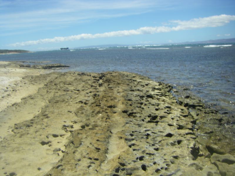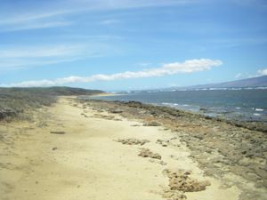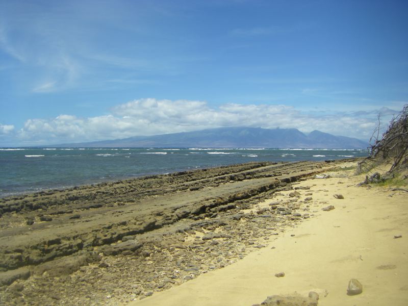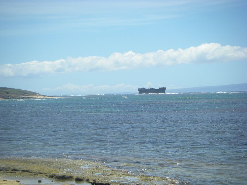 Shipwreck Beach is on the east coast of Lanai, a wild beach of sand and volcanic rock. The eroded lava sticks out here and there with its sponge-like structure of black rock full of bubbles. At first it looked like an old road bed, but no one builds roads from rock like that. The beach curves this way and that, and around one turn the shipwreck appears, resting on some shoal.