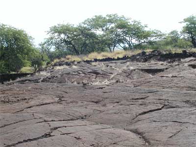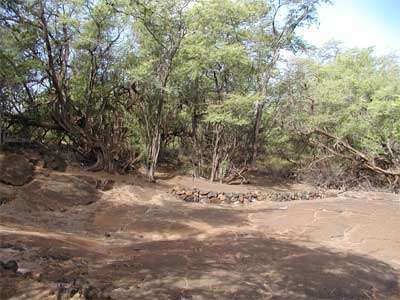 ![]() At one point, all of Hawaii was lava. Some of it still shows, but there was also water, and the kiawe. These trees are among the first to colonize the bare stone, growing from cracks and crevasses. They break the rock into stones and then into soil. The petroglyph tail leads through this forest of spooky, twisted trees. |