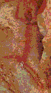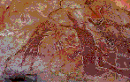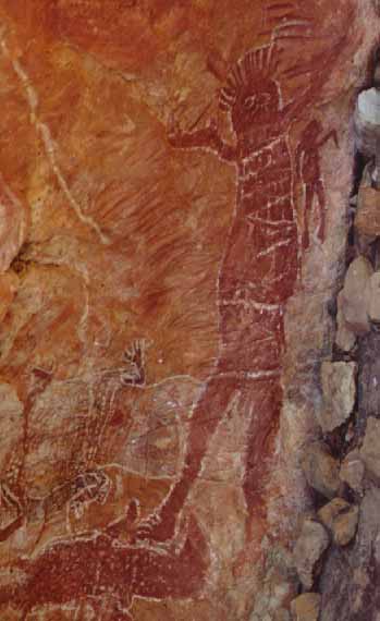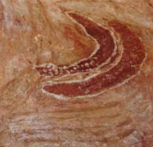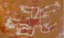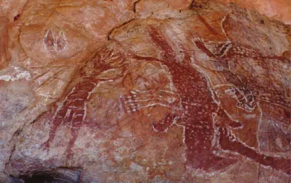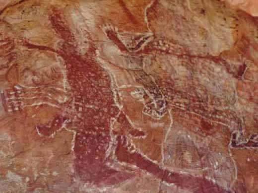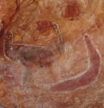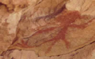 The art work is painted on the inside of a small, shallow cave at the base of one of the major hills comprising this odd formation. The space is not large, but it could easily have served as a shelter.