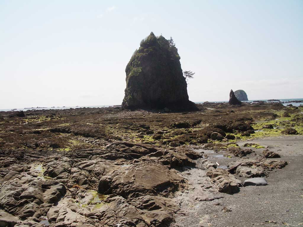 From Cape Alava to Sand Point At low tide, the Pacific Ocean is far from the beach, separated by a rough, rocky and scraggly field of rocks, seaweed and tidepools. You can explore this field, but it can be tricky, especially on wet days when the seaweed is slick. We usually stick to the band of rock and sands at the base of the forest, but even this track is often blocked by driftwood and fallen trees. It often takes a bit of thinking and a bit of doing to find a safe path through these obstacles. Some of the trunks are four feet in diameter, and several trunks often intertwine and make passage a puzzle. |