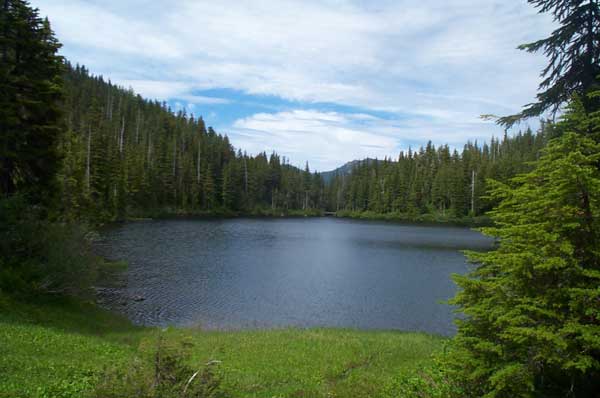 climb is worth it. We were once struggling with the meaning of our existence as we climbed this trail, rock strewn and cougar infested, but then we ran into a twelve year old girl carrying a pack that probably weighed as much as she did. She was barreling along and we took heart. After all, we weren't going to let an overburdened twelve year old make us look like fogies. But, even she started to falter. "Where is this lake anyway?", she asked existentially. But by now, we were at 1400', so it was we, older and wiser, gasping and wheezing who offered HER hope. We had a digital altimeter and had checked the guidebooks, so we reassured her that there were only another hundred feet to climb. Amazingly, the guidebook had been