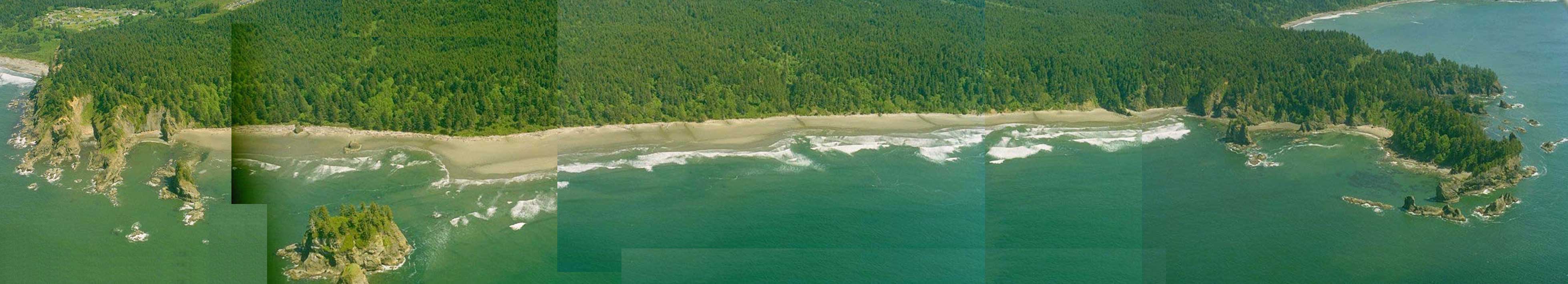 Once we get started, it's hard to stop. Here is another composite of one of our favorite Kaleberg hikes, Second Beach. Right now, in October 2005, Second Beach is closed as a result of a dispute between the Quillayute tribe and the federal government. The tribe would really like to have someplace to evacuate to in the event of a tsunami, but the originally intended refuge is currently zoned as wilderness. A compromise involving a land swap is in the works, and we hope it comes through. The trailhead for the Second Beach hike is on tribal land.
