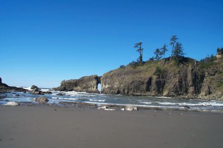 UPDATE - 15 April 2007- Second Beach is OPEN. While there is no official agreement yet, the local Quillayute tribe feels that they are close enough to reopen the beach for the tourist season. This is great news. It means that one of our favorite beaches is being reopened, and that the Quillayute will have somewhere to go in the event of a tsunami. Since this is a local matter, there is not all that much in the media, but check out this KNDO/KNDU/AP article and this Peninsula Daily News background piece and update. Second Beach is one of a series of three beaches along the road to La Push. Unlike Rialto Beach, getting to Second Beach has the added drama of a forest walk through ferns and cedars, first up hill and then down the canyon to the open beach. It is like coming outdoors when you arrive at the sea, a wonderfully dramatic effect. Unlike Cape Alava, the hike to the beach is short, a bit less than a mile, so you can still get back to Bella Italia for dinner. In addition to the forest walk, Second Beach offers wild rock formations, a broad open beach, gloriously twisted driftwood, tidepools, beach streams and a little cave to explore at low tide. How to Get ThereHead west from Port Angeles on route 101 and continue past Sappho. Before you get to Forks, keep your eyes open for the signs to route 110 to La Push. The turn is right after the Smokehouse Restaurant. Follow the road west and go past the little restaurant and general store on your right. They have good espresso and excellent blackberry pie here, but you want to stay on the road to La Push. After another four or five miles, start watching for the Second Beach parking lot on your left.