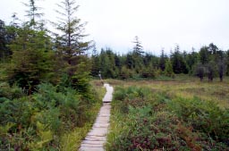 Very soon after the fork you are on the boardwalk. This can get slippery on wet days, but it is much, much better than the mud one had to trek through up until the 1970s. The trail goes down into secret valleys with ferns and skunk cabbage, and then up, past giant trees and murky forest. On through the green world it runs, up and down the wooden steps, across the endless wooden planks.