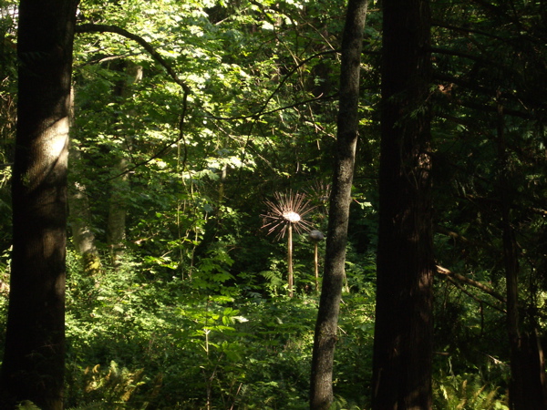 When you walk through the woods you look at things a certain way. In the Northwest there are tall trees, green ferns, branching salal and a great green undergrowth. The tones are brown and green, and the sunlight is filtered. One is used to finding little details - mushrooms, trilium flowers, slugs, salamanders, maybe a deer or mountain beaver. Here the artists get to play with your expectations, and some of the works - wood sculptures, hanging canoes, spider webs, crushed glass, colored windows, gateways, cairns, and other fascinating forms - are set into this sylvan background. There is a confusion of the man made and natural.