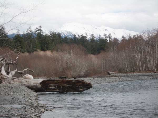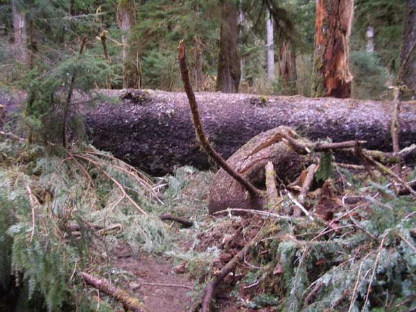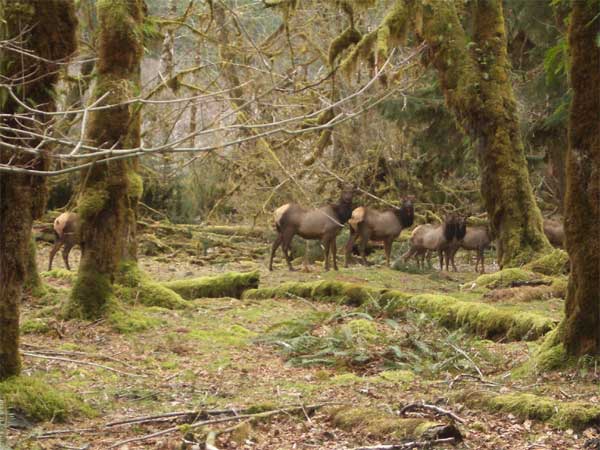 This winter was the winter of the high winds, and they even damaged some of the big trees in the relatively well protected Hoh Valley. We made it as far as Five Mile Island. There were a good number of trees down on the trail, including some giants, but bushwhacking over, under and around wasn't too hard. At least the trail wasn't flooded or muddy. The river itself was green blue. The snows haven't started melting yet, so there wasn't the usual milky blue color you see in the summer. The little waterfalls were spectacular. The pictures here are mostly of trees right by the trail, some blocking it. The last picture is of the herd of elk we saw at Five Mile Island. They seemed to have weathered the season quite well. - The Kalebergs