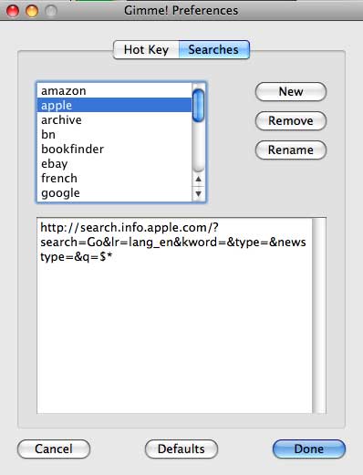 You can add and remove searches from the alphabetized list. The New button lets you create a new search. The Remove button removes the selected search. The Rename button lets you specify a new keyword for that search. The lower window shows the URL expansion that will be used to do the actual search in your default browser. The sequence $* is replaced with the remainder of the line in the search. So, if you typed in a search "apple backup preferences", Gimme! would select the apple search string and substitute backup+preferences for the $* in the URL, then tell your default browser to load the URL. A search may also contain $1, $2, $3 and so on to indicate the first, second, third, and so on word in the search string so you can build more structured searches. See the orbitz and googleon examples to see how this might work. The Done button saves any changes you have made. The Cancel button discards them! The Defaults button reapplies the set of default searches that Gimme! comes with. |